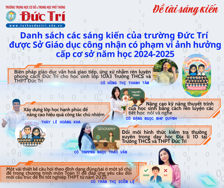 Chúc mừng các đề tài sáng kiến của trường Đức Trí được Sở Giáo dục công nhận có phạm vi ảnh hưởng cấp cơ sở năm học 2024-2025.