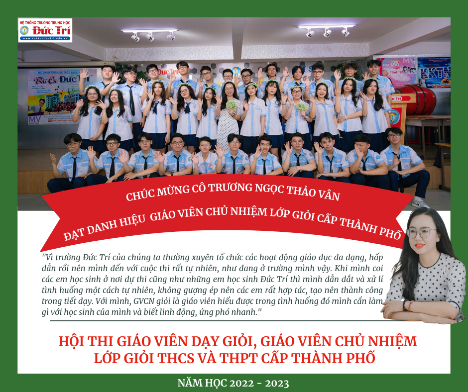 Cô Thảo Vân chia sẻ: "Vì trường Đức Trí của chúng ta thường xuyên tổ chức các hoạt động giáo dục đa dạng, hấp dẫn rồi nên mình đến với cuộc thi rất tự nhiên, như đang ở trường mình vậy. Khi mình coi các em học sinh ở nơi dự thi cũng như những em học sinh Đức Trí thì mình dẫn dắt và xử lí tình huống một cách tự nhiên, không gượng ép nên các em rất hợp tác, tạo nên thành công trong tiết dạy. Với mình, GVCN giỏi là giáo viên hiểu được trong tình huống đó mình cần làm gì với học sinh của mình và biết linh động, ứng phó nhanh." Cô Thảo Vân cũng là Đảng viên trẻ hoạt động rất năng nổ, gương mẫu. Trong Đại hội Công đoàn cơ sở nhiệm kì 2023 – 2028 vừa qua, cô Thảo Vân được tín nhiệm bầu làm Chủ tịch Công đoàn trường THCS và THPT Đức Trí.