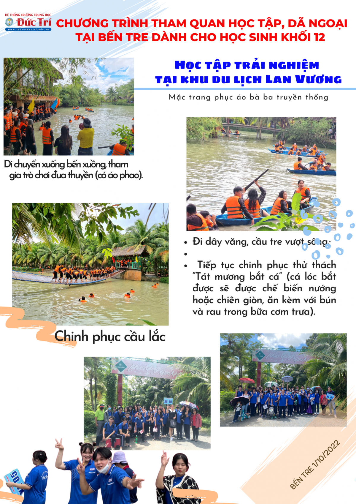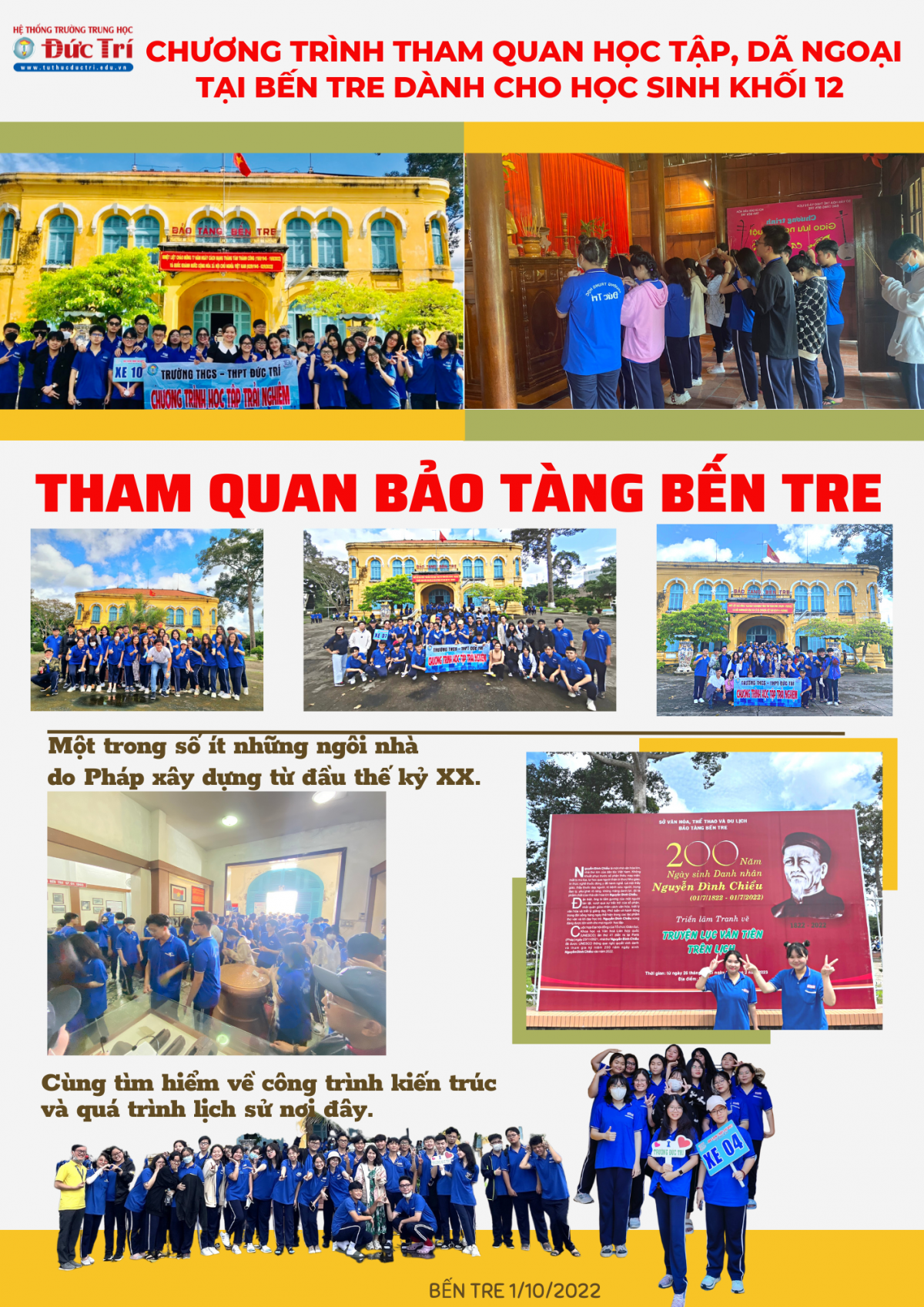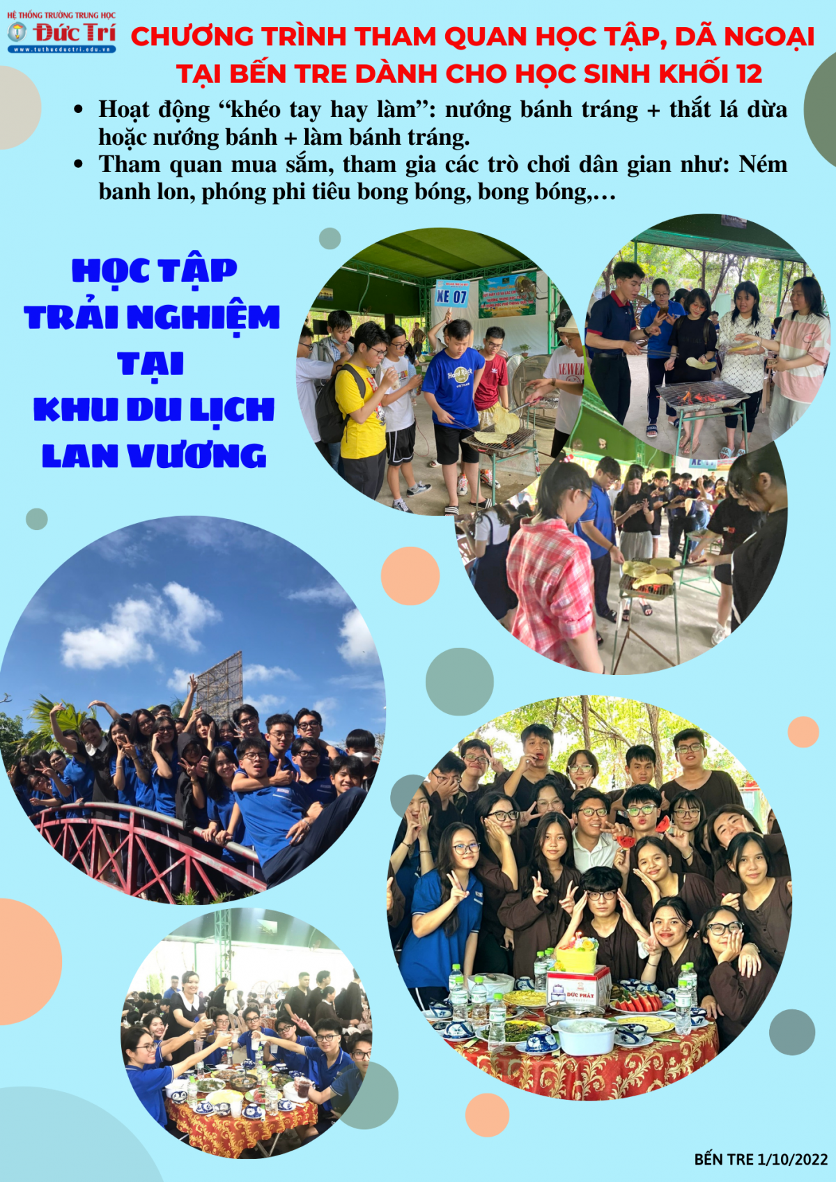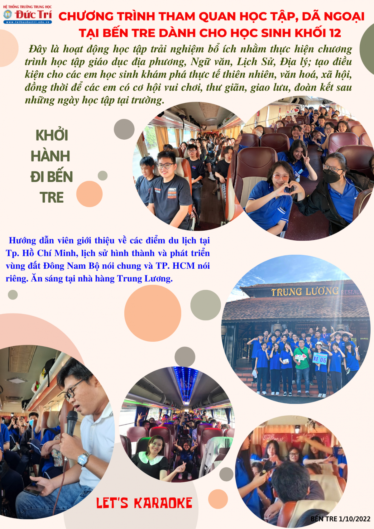 Các em học sinh khối 12 trường Đức Trí đã có một chuyến đi học tập trải nghiệm an toàn, lành mạnh, bổ ích vào ngày 1/10/2022.