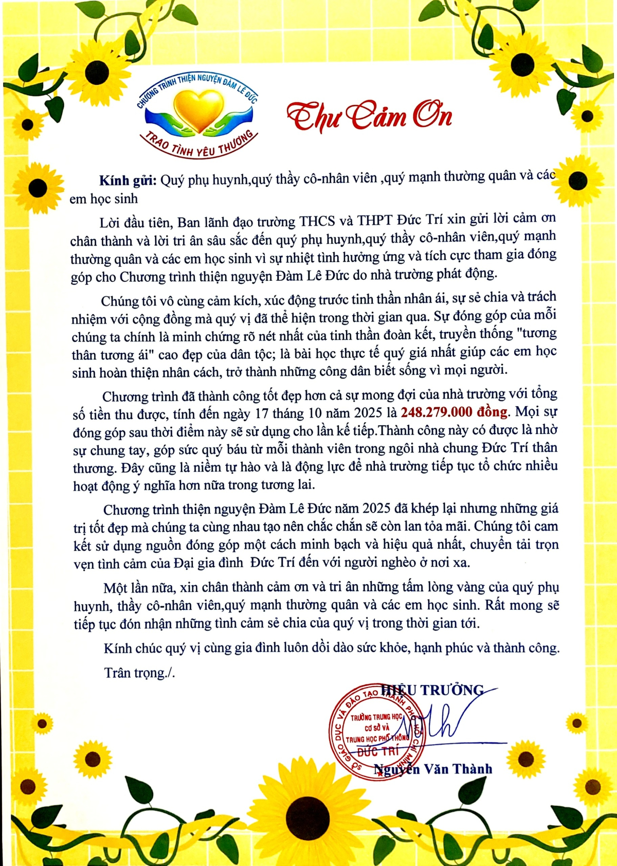Lời đầu tiên, Ban lãnh đạo trường THCS và THPT Đức Trí xin gửi lời cảm ơn chân thành và lời tri ân sâu sắc đến quý phụ huynh, quý thầy cô - nhân viên, quý mạnh thường quân và các em học sinh vì sự nhiệt tình hưởng ứng và tích cực tham gia đóng góp cho CHƯƠNG TRÌNH THIỆN NGUYỆN ĐÀM LÊ ĐỨC do nhà trường phát động.