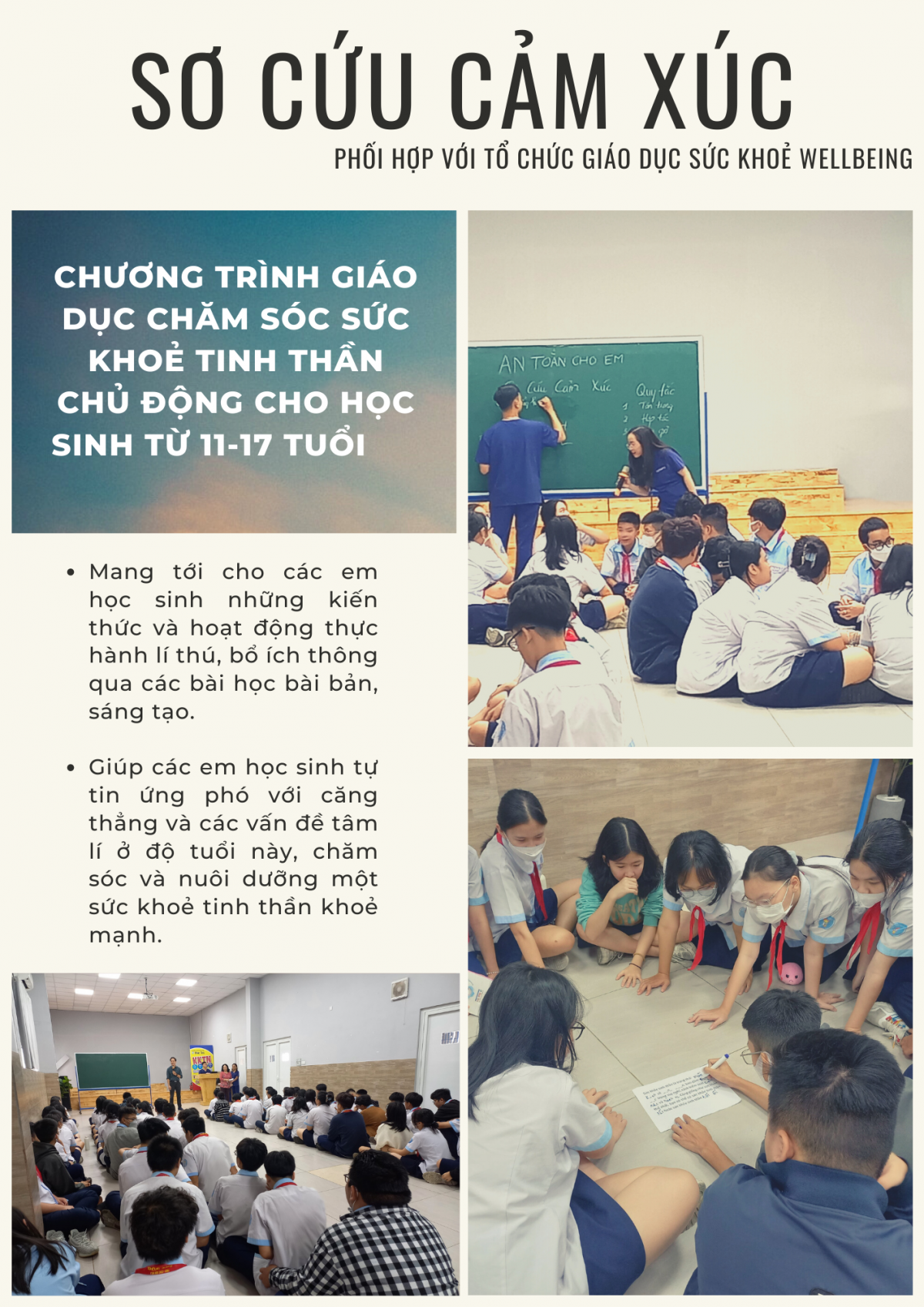 Là chương trình giáo dục chăm sóc sức khoẻ tinh thần chủ động cho học sinh từ 11-17 tuổi, “Sơ cứu cảm xúc” mang tới cho các em học sinh những kiến thức và hoạt động thực hành lí thú, bổ ích thông qua các bài học bài bản, sáng tạo. Chương trình giúp các em học sinh tự tin ứng phó với căng thẳng và các vấn đề tâm lí, chăm sóc và nuôi dưỡng một sức khoẻ tinh thần khoẻ mạnh.