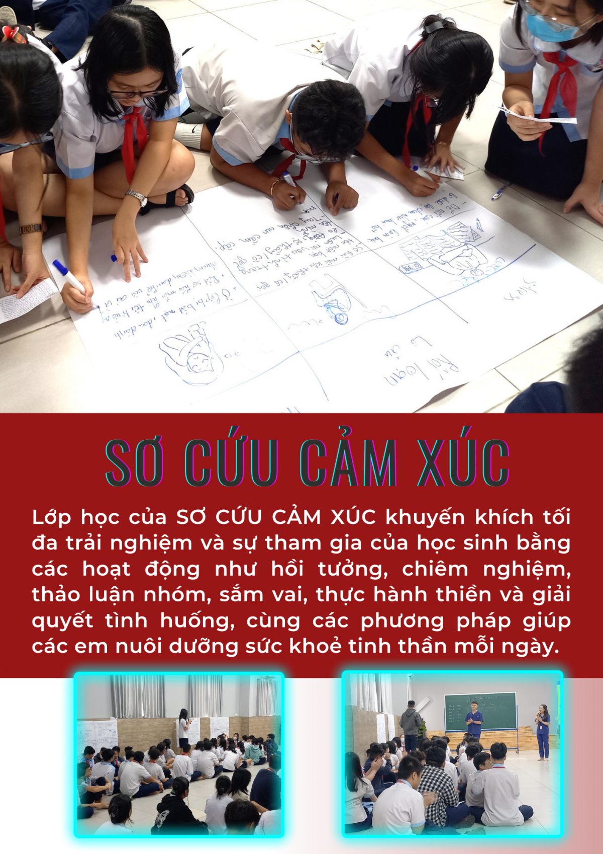 Lớp học của SƠ CỨU CẢM XÚC đã khuyến khích tối đa trải nghiệm và sự tham gia của học sinh bằng các hoạt động như hồi tưởng, chiêm nghiệm, thảo luận nhóm, sắm vai, thực hành thiền và giải quyết tình huống, cùng các phương pháp giúp các em nuôi dưỡng sức khoẻ tinh thần mỗi ngày.