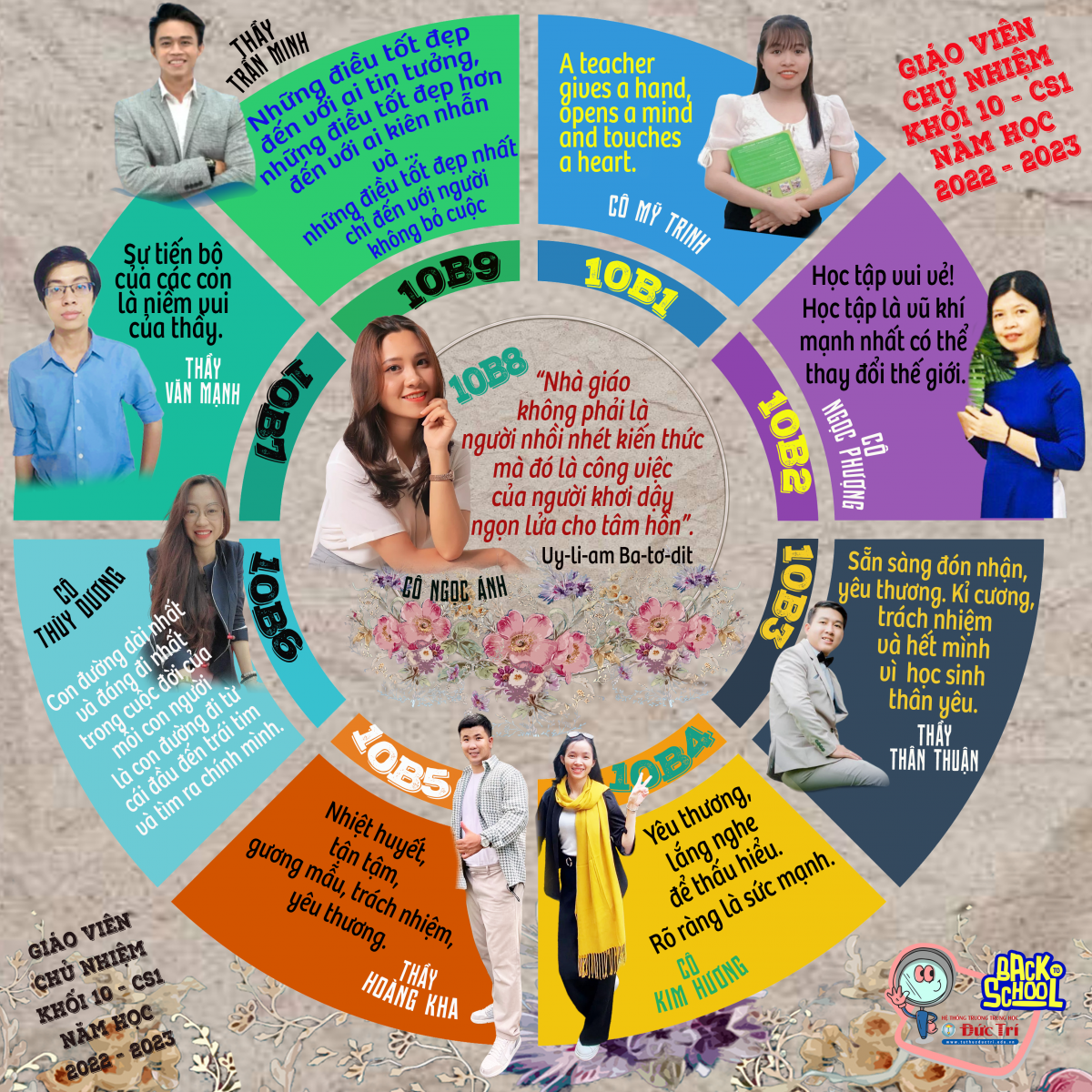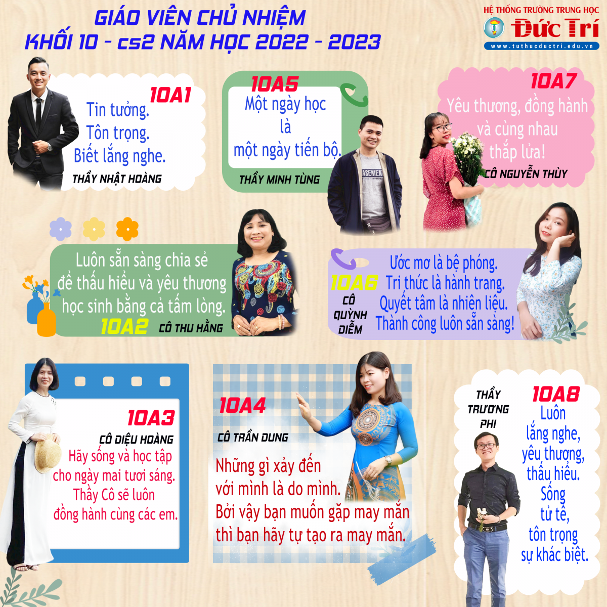 ![]() | Đầu cầu khối 10 cơ sở 2 xin được chào đón đại gia đình Đức Trí nhé! Và đây là những thầy cô giáo tận tâm, sáng tạo sẵn sàng nâng bước cho những chú heo vàng 2k7 có một năm học thật thành công: Lớp 10A1: Thầy Nhật Hoàng Lớp 10A2: Cô Thu Hằng Lớp 10A3: Cô Diệu Hoàng Lớp 10A4: Cô Trần Dung Lớp 10A5: Thầy Minh Tùng Lớp 10A6: Cô Quỳnh Diễm Lớp 10A7: Cô Nguyễn Thùy Lớp 10A8: Thầy Trương Phi |