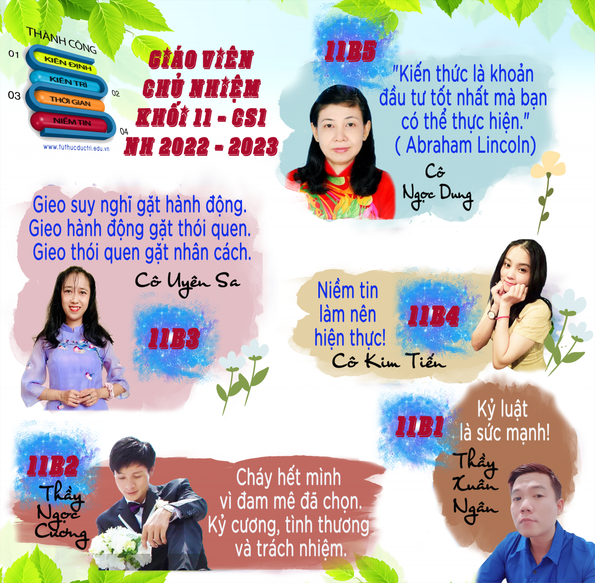 | Khối 11 là giai đoạn đậm nét dấu ấn thanh xuân của thời học sinh. Lúc này các bạn chưa cần phải quá lo lắng chuyện thi cử, hướng nghiệp tương lai; cũng không còn rụt rè, bỡ ngỡ như “tấm chiếu mới” lớp 10 nữa. Khối 11 là thời điểm cho cá tính tỏa sáng và tìm hiểu chính bản thân mình. Tuy nhiên, chương trình học của năm lớp 11 là bước đệm rất quan trọng kết nối với lớp 12 và không thể lơ là chút nào đâu teen ạ. Chính vì vậy, nhà trường đã lựa chọn những giáo viên vừa tâm lý vừa rất bản lĩnh để đồng hành cùng khối 11 thân yêu. Cùng chào đón các thầy cô chủ nhiệm khối 11 cơ sở 1: Lớp 11B1: Thầy Xuân Ngân Lớp 11B2: Thầy Ngọc Cương Lớp 11B3: Cô Uyên Sa Lớp 11B4: Cô Kim Tiến Lớp 11B5: Cô Ngọc Dung | ![]() |