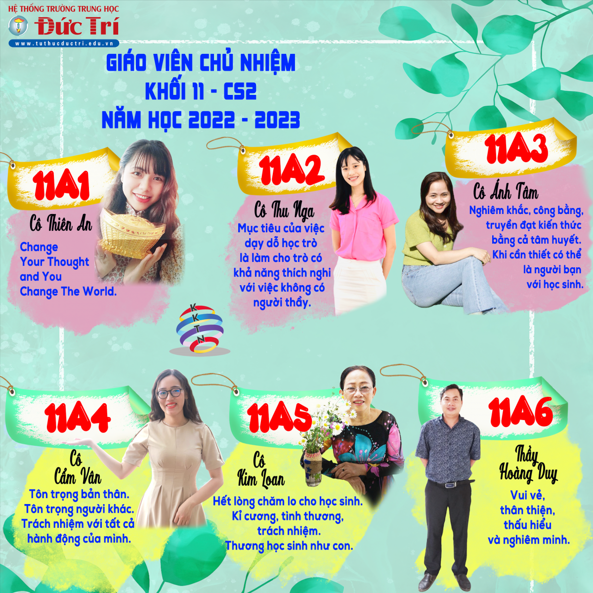 ![]() | Khối 11 là giai đoạn đậm nét dấu ấn thanh xuân của thời học sinh. Lúc này các bạn chưa cần phải quá lo lắng chuyện thi cử, hướng nghiệp tương lai; cũng không còn rụt rè, bỡ ngỡ như “tấm chiếu mới” lớp 10 nữa. Khối 11 là thời điểm cho cá tính tỏa sáng và tìm hiểu chính bản thân mình. Tuy nhiên, chương trình học của năm lớp 11 là bước đệm rất quan trọng kết nối với lớp 12 và không thể lơ là chút nào đâu teen ạ. Chính vì vậy, nhà trường đã lựa chọn những giáo viên vừa tâm lý vừa rất bản lĩnh để đồng hành cùng khối 11 thân yêu. Cùng chào đón các thầy cô chủ nhiệm khối 11 cơ sở 2: Lớp 11A1: Cô Thiên An Lớp 11A2: Cô Thu Nga Lớp 11A3: Cô Ánh Tâm Lớp 11A4: Cô Cẩm Vân Lớp 11A5: Cô Kim Loan Lớp 11A6: Thầy Hoàng Duy |