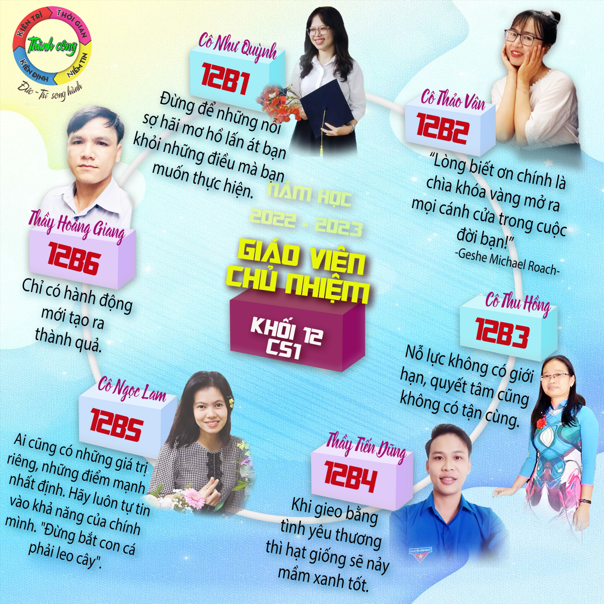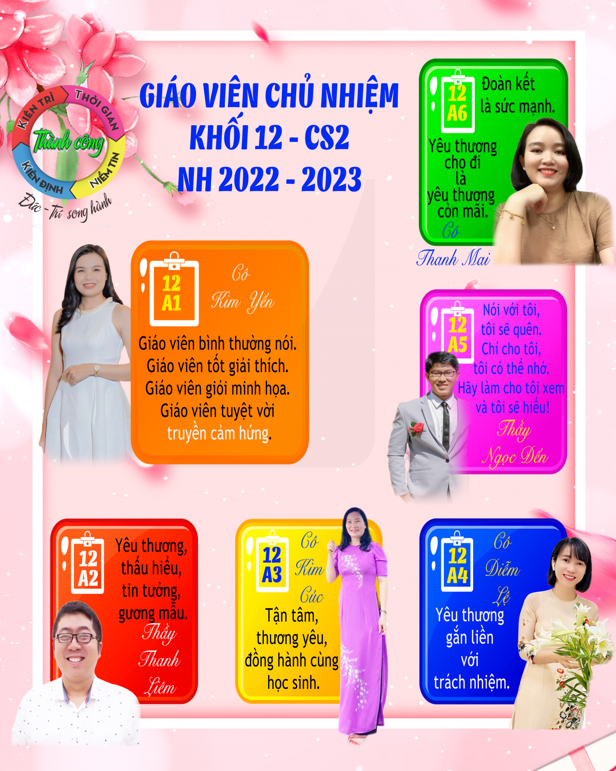 ![]() | Mỗi thầy cô một phong cách nhưng đặc điểm chung của các giáo viên được chọn mặt gửi vàng chủ nhiệm khối 12 của trường Đức Trí là giỏi chuyên môn, nhạy bén, tận tâm, cân được tất tần tật những điều quan trọng của năm học cuối cấp. Chúng ta thật yên tâm cùng khối 12 ra khơi với các thuyền trưởng cơ sở 2 là: Lớp 12A1: Cô Đặng Ngọc Kim Yến Lớp 12A2: Thầy Phan Thanh Liêm Lớp 12A3: Cô Nguyễn Thị Kim Cúc Lớp 12A4: Cô Trần Thị Diễm Lệ Lớp 12A5: Thầy Trần Ngọc Đến Lớp 12A6: Cô Đào Thị Thanh Mai |