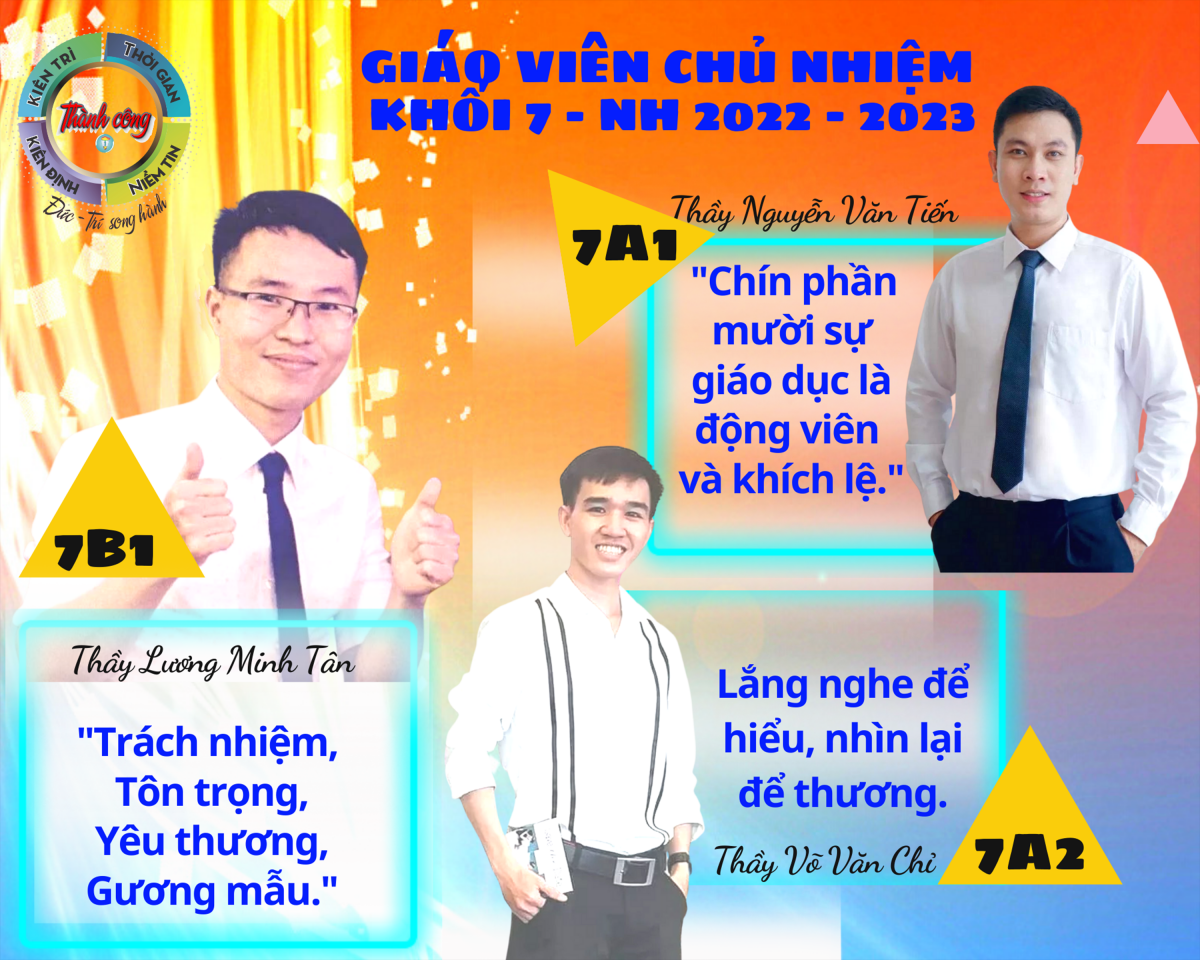| Là những giáo viên giàu lòng yêu nghề, các thầy giáo chủ nhiệm khối lớp 7 của trường Đức Trí năm học này đã có những phương châm giáo dục thật ý nghĩa, đong đầy sự quan tâm tới học sinh. Với thầy Thầy Lương Minh Tân – GVCN lớp 7B1 thì “Trách nhiệm - Tôn trọng - Yêu thương - Gương mẫu” là những giá trị được đặt lên hàng đầu trong công tác chủ nhiệm. Thầy Nguyễn Văn Tiến – GVCN lớp 7A1 tâm niệm: "Chín phần mười sự giáo dục là động viên và khích lệ." Với thầy Võ Văn Chỉ - GVCN lớp 7A2 đó là luôn “Lắng nghe để hiểu, nhìn lại để thương.” | ![]() |