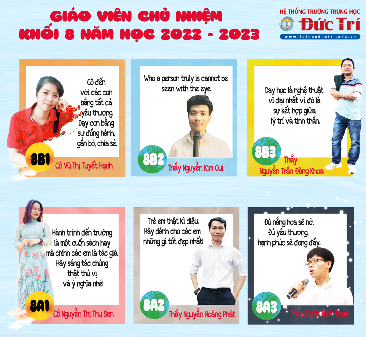 | Khối 8 năm nay của trường Đức Trí gồm 6 lớp với các thầy cô chủ nhiệm: Lớp 8B1: Cô Vũ Thị Tuyết Hạnh Lớp 8B2: Thầy Nguyễn Kim Qui Lớp 8B3: Thầy Nguyễn Trần Đăng Khoa Lớp 8A1: Cô Nguyễn Thị Thu Sen Lớp 8A2:Thầy Nguyễn Hoàng Phát Lớp 8A3: Thầy Đoàn Đình Đạm Cùng đọc những câu phương châm chủ nhiệm để hiểu hơn thầy cô của mình và mến chúc khối 8 một năm học NĂNG ĐỘNG, CHẤT LƯỢNG nhé! | ![]() |