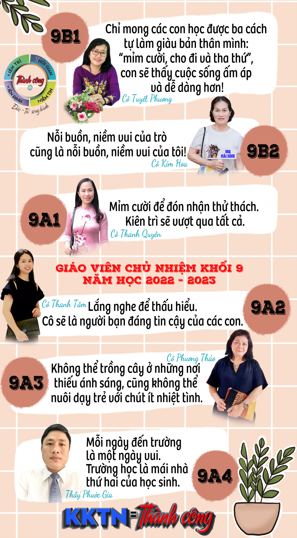 ![]() | Khối lớp 9 - cột mốc đánh dấu sự bứt phá quan trọng của bản thân. Đây là năm học cuối cùng của cấp trung học cơ sở, hoàn thiện hành trang người thiếu niên để tung đôi cánh thật vững vàng bay vào cấp trung học phổ thông, trở thành thanh niên. Sáu cơ trưởng giỏi giang, bản lĩnh, toàn tâm được nhà trường tin tưởng lựa chọn nâng cánh cho các em học sinh khối 9 trong năm học này là những thầy cô: Lớp 9B1: Cô Tuyết Phương Lớp 9B2: Cô Kim Hoa Lớp 9A1: Cô Thanh Quyên Lớp 9A2: Cô Thanh Tâm Lớp 9A3: Cô Phương Thảo Lớp 9A4: Thầy Phước Gia Một năm học thật chất lượng, tiến bộ, đẹp và yêu thương các em nhé! |
