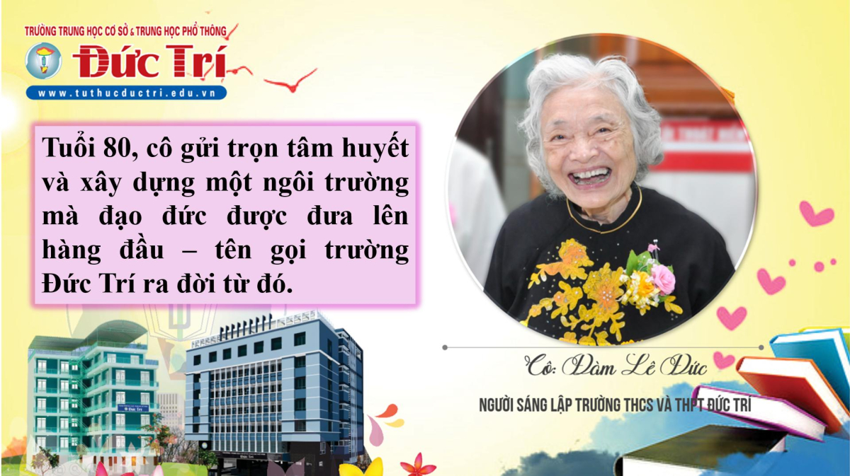 Giáo dục đạo đức thật tốt cho học sinh luôn là điều mà quý phụ huynh, thầy cô và toàn xã hội tha thiết mong mỏi. Lúc sinh thời, cố nhà giáo Đàm Lê Đức nổi tiếng với những bài dạy đạo đức, hiếu nghĩa đúc rút từ những điều giản dị, bình thường trong cuộc sống đi vào lòng bao thế hệ học sinh và cả phụ huynh. Tuổi 80, cô gửi trọn tâm huyết xây dựng một ngôi trường mà đạo đức được đưa lên hàng đầu – tên gọi trường Đức Trí ra đời từ đó.