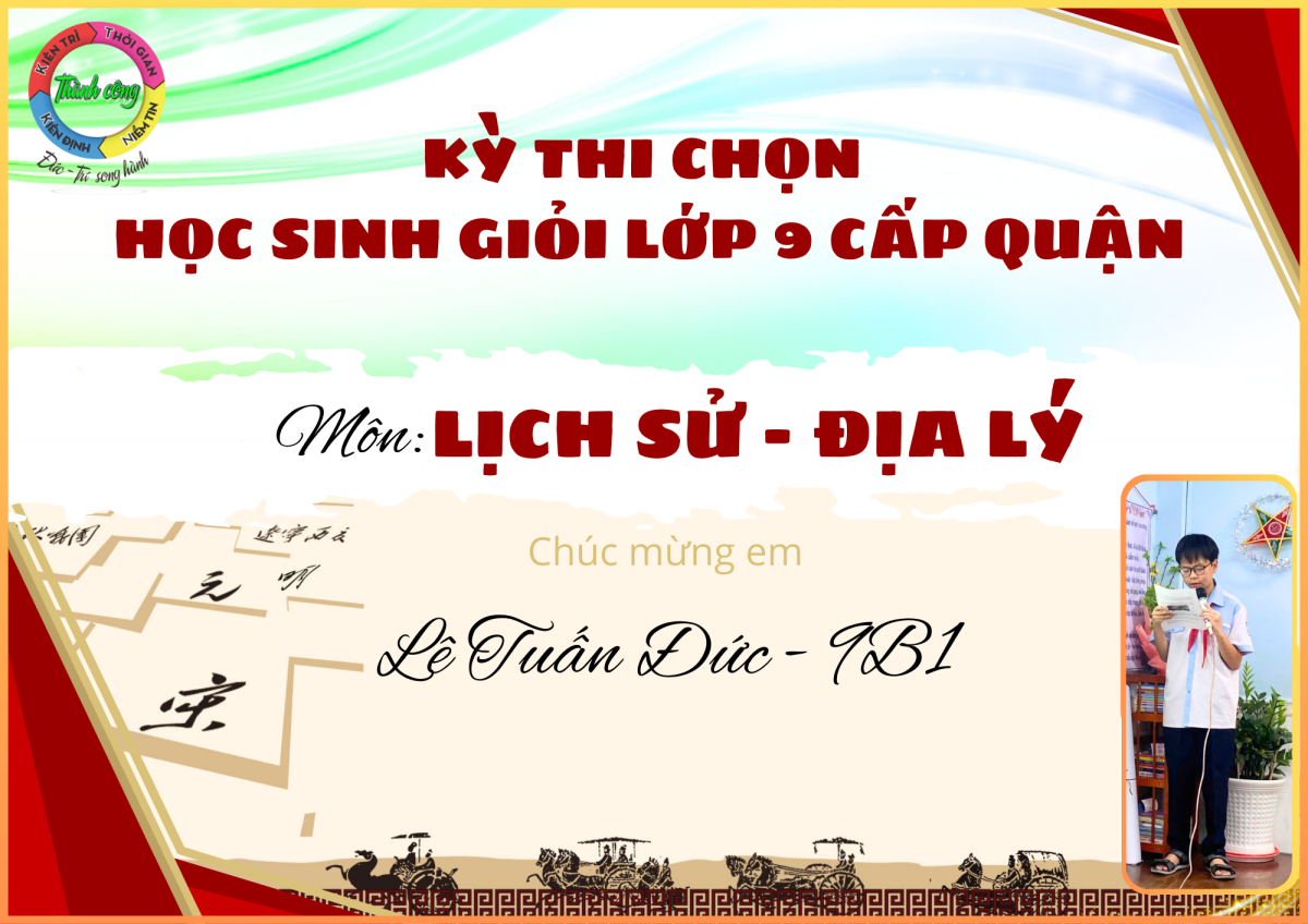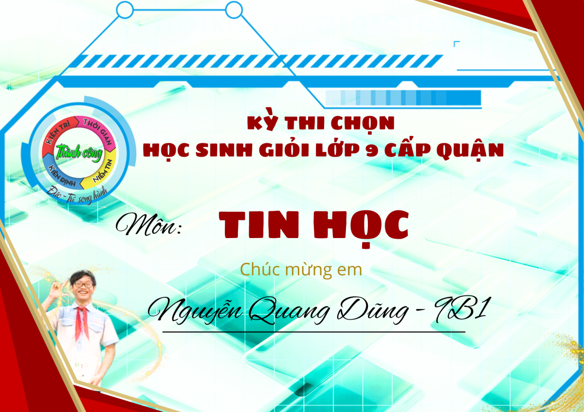 - Nguyễn Quang Dũng lớp 9B1 đạt giải môn Tin học và em Lê Tuấn Đức lớp 9B1 đạt giải môn Lịch sử và Địa lý trong kỳ thi chọn Học sinh giỏi lớp 9 - cấp quận, năm học 2024 – 2025 !