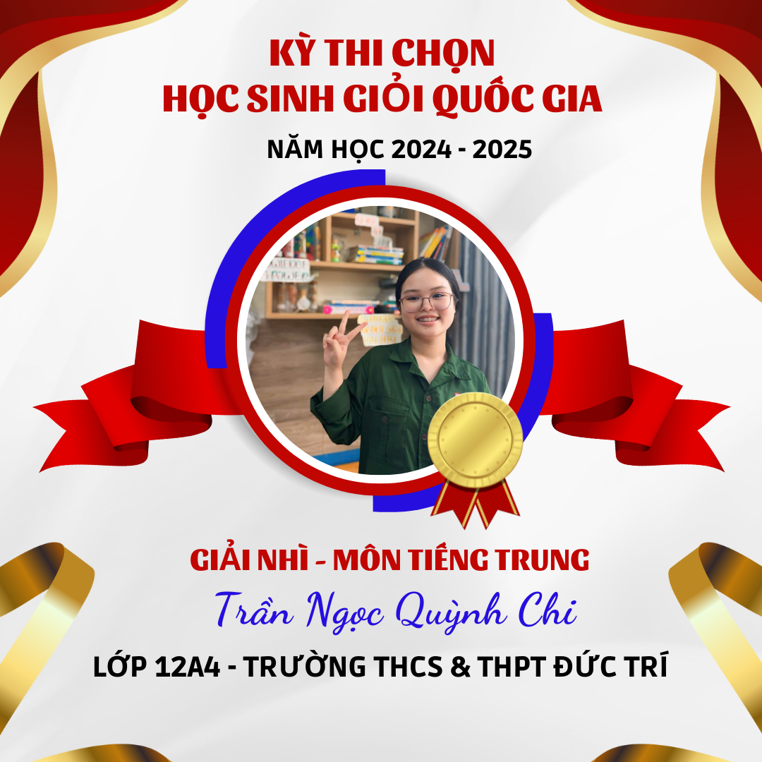 - Trần Ngọc Quỳnh Chi lớp 12A4 xuất sắc giành Giải Nhì - Kỳ thi chọn Học sinh giỏi quốc gia THPT năm học 2024 - 2025 môn Tiếng Trung