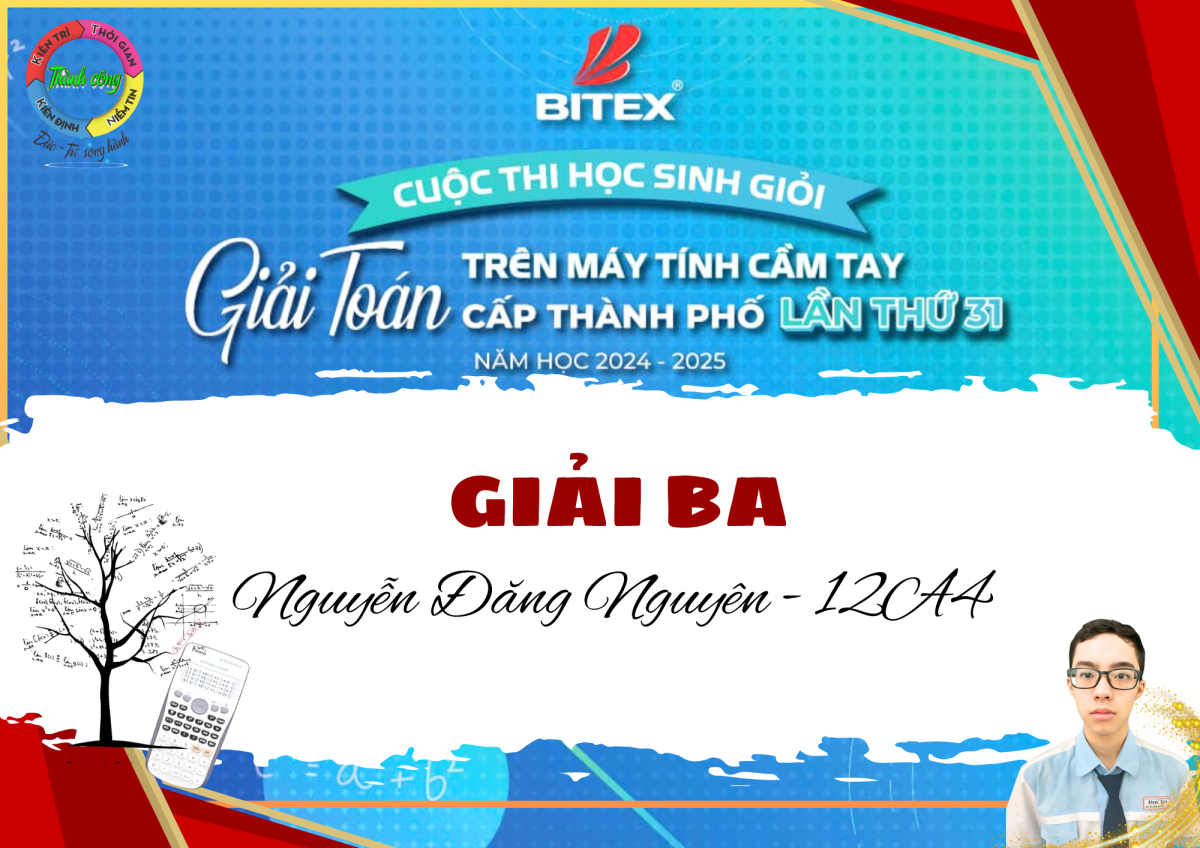 - Nguyễn Đăng Nguyên lớp 12A4 trường Đức Trí xuất sắc giành Giải Ba - Kỳ thi học sinh giỏi giải toán trên máy tính cầm tay – cấp thành phố, lần thứ 31, năm học 2024-2025!