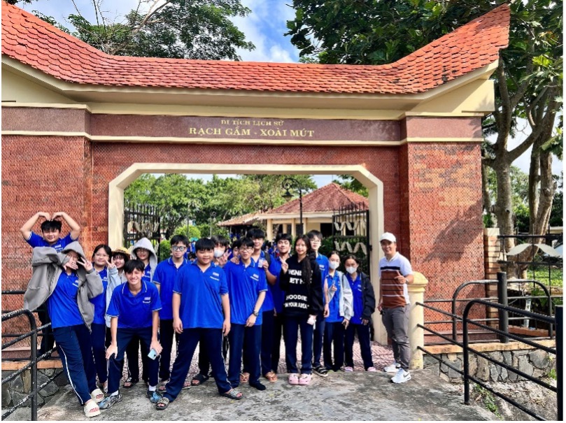 Ở đây các em ngoài được tham quan tượng đài được xây dựng để tưởng nhớ đến vị anh hùng dân tộc Nguyễn Huệ, người đã có công lao to lớn trong chiến thắng Rạch Gầm Xoài Mút thể hiện ý chí quyết tâm chống giặc ngoại xâm của nhân dân ta. Ngoài ra, các em còn được tham quan bảo tàng trưng bày nhiều hiện vật, tư liệu quý giá liên quan đến trận thủy chiến, giúp du khách hiểu rõ hơn về diễn biến lịch sử và ngôi nhà cổ mang đậm nét kiến trúc của vùng Nam Bộ, tái hiện cuộc sống của người dân thời xưa. Sau cùng, hoạt động cuối cùng trước khi rời địa điểm đầy ý nghĩa này là lễ dâng hương của thầy cô và học sinh trường để tỏ lòng thành kính với các anh hùng liệt sĩ đã hy sinh vì độc lập tự do của Tổ quốc.