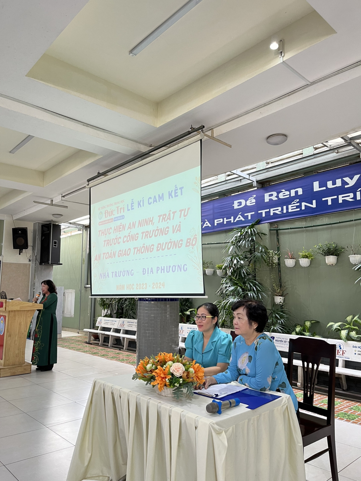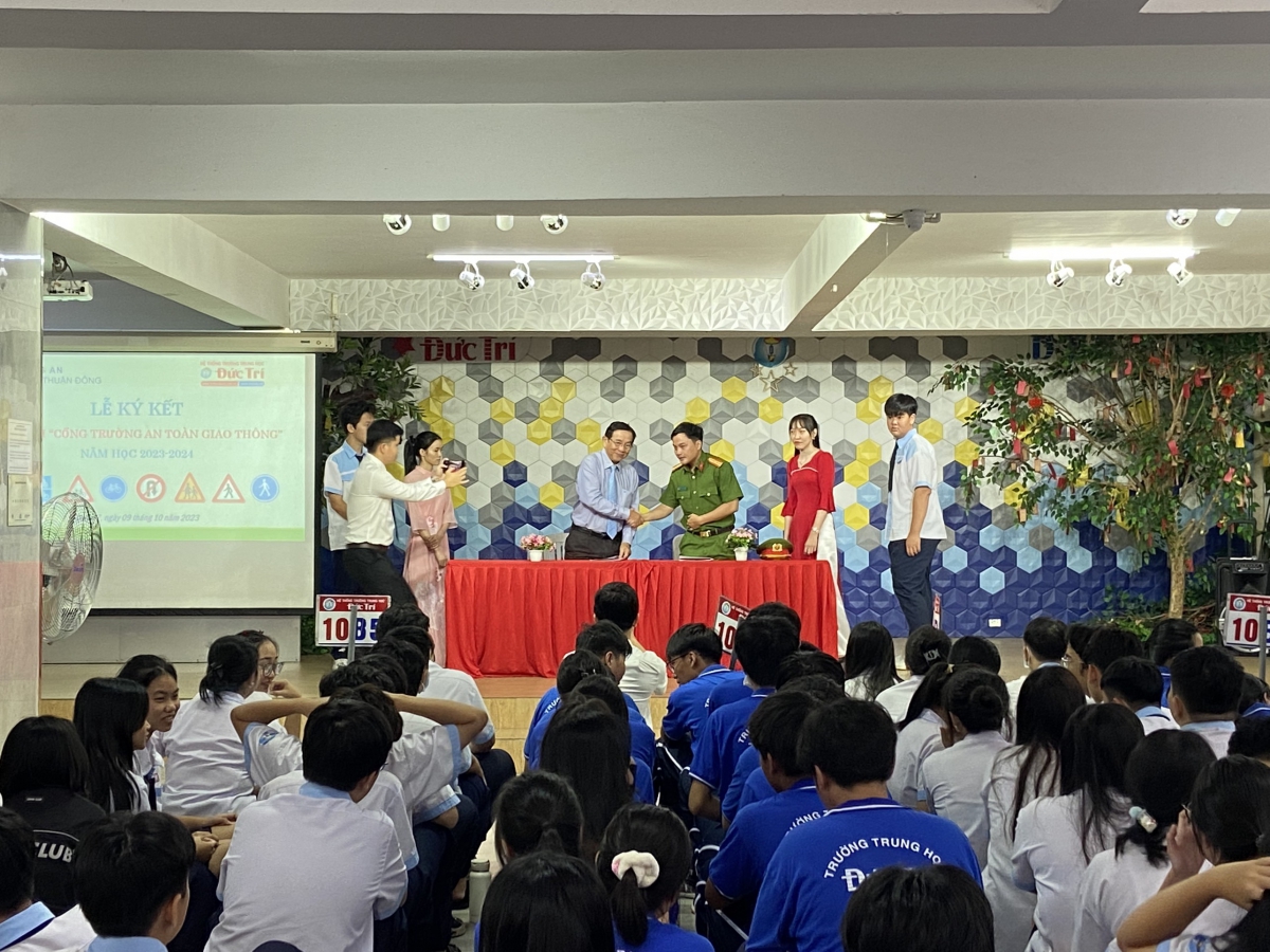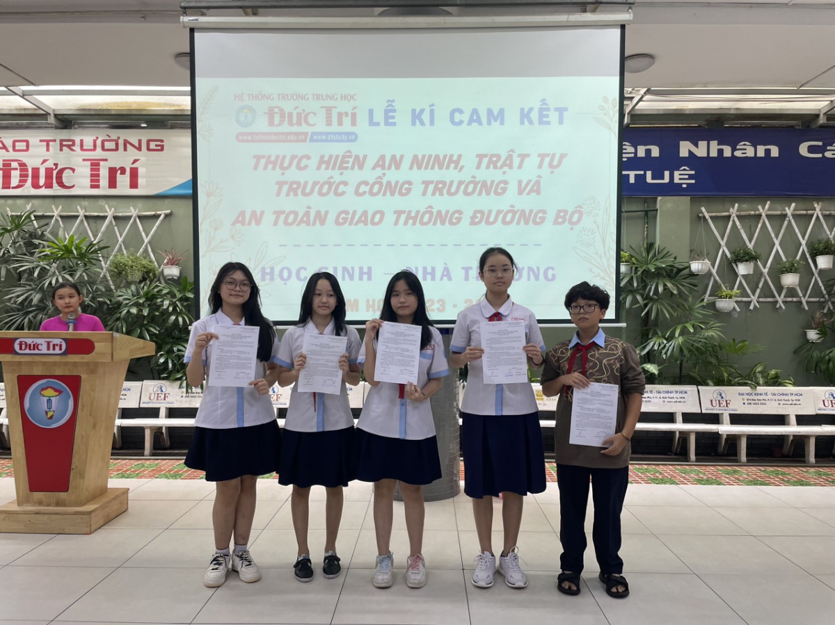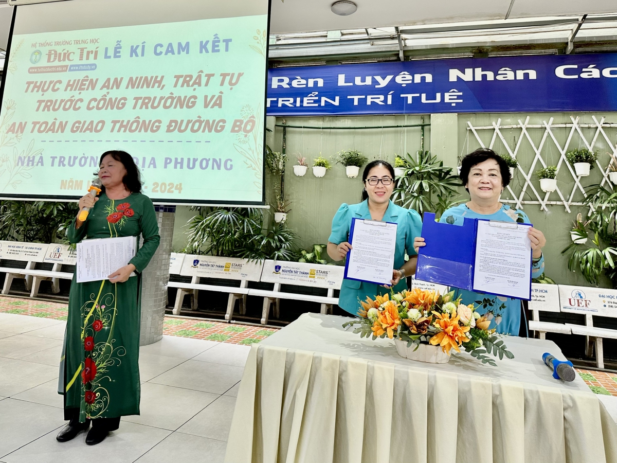 Thực hiện kế hoạch liên tịch giữa nhà trường và chính quyền địa phương, ngày 09/10/2023, tại 2 cơ sở, trường THCS và THPT Đức Trí đã phối hợp với UBND phường Tân Thuận Đông và UBND phường 4 quận Phú Nhuận tổ chức Lễ ký kết phối hợp thực hiện An ninh trật tự, an toàn giao thông khu vực quanh khuôn viên trường. Nội dung cam kết tập trung vào công tác phối hợp tuyên truyền, phổ biến, giáo dục pháp luật về an toàn giao thông; hỗ trợ các điều kiện để cán bộ, giáo viên, nhân viên, học sinh và cha mẹ học sinh tuân thủ Luật giao thông đường bộ năm 2008, đảm bảo an ninh trật tự trong và ngoài nhà trường ở mọi thời điểm, đặc biệt là giờ cao điểm.