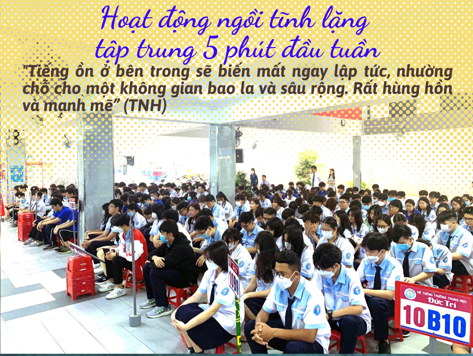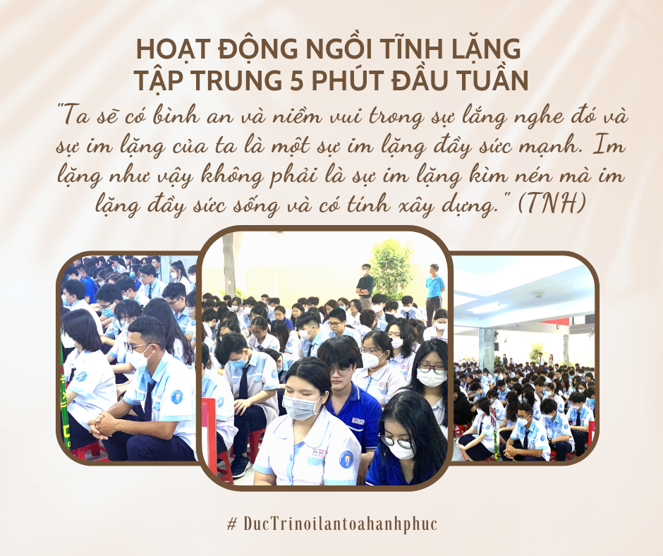 Trong giờ sinh hoạt đầu tuần, các bạn học sinh khối 10 ở cs1 đã được trải nghiệm Hoạt động ngồi tĩnh lặng tập trung 5 phút đầu tuần. Ôi, hay lắm nha, "Tiếng ồn ở bên trong sẽ biến mất ngay lập tức, nhường chỗ cho một không gian bao la và sâu rộng. Rất hùng hồn và mạnh mẽ” (TNH).