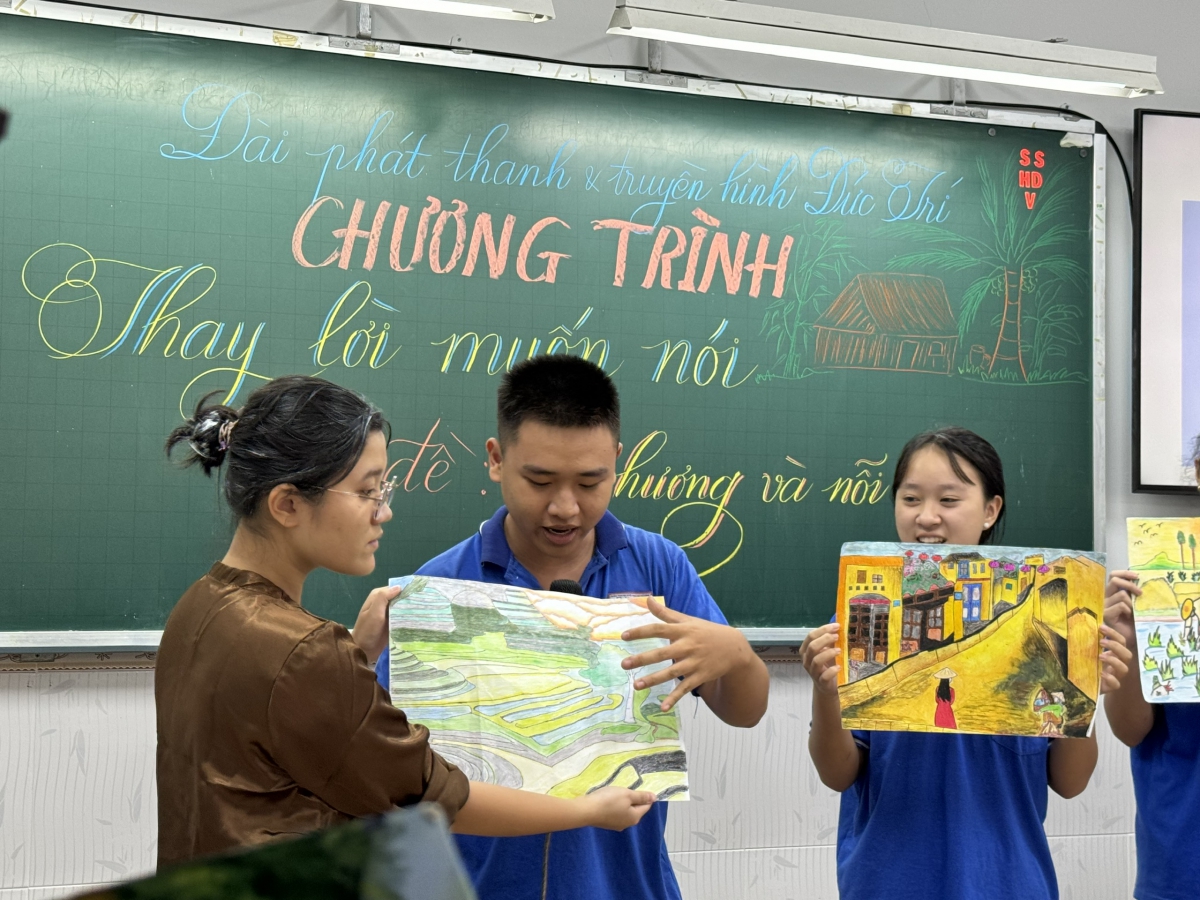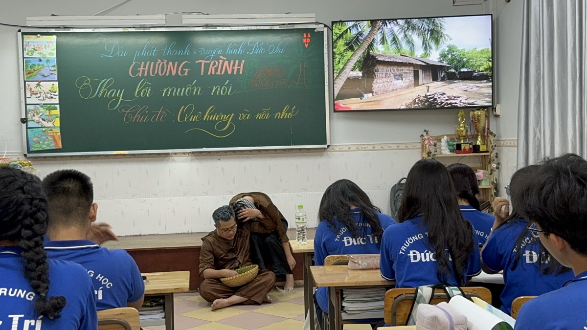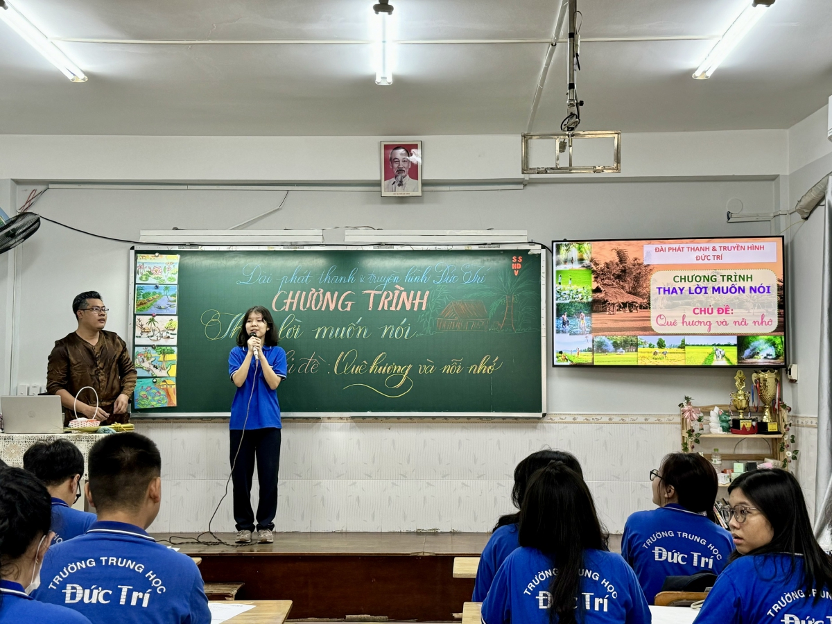 Xuất phát từ yêu cầu cần đạt của từng chủ đề học tập nói riêng và bộ môn nói chung, ngày 5/4/2024, thầy Đặng Thừa Ân – giáo viên tổ Ngữ văn trường THCS và THPT Đức Trí đã tổ chức tiết học Luyện tập rèn kỹ năng viết tích hợp kỹ năng nói và nghe về một vấn đề xã hội trong tác phẩm nghệ thuật với hình thức sáng tạo : Chương trình “Thay lời muốn nói”, chủ đề : “Quê hương và nỗi nhớ”.