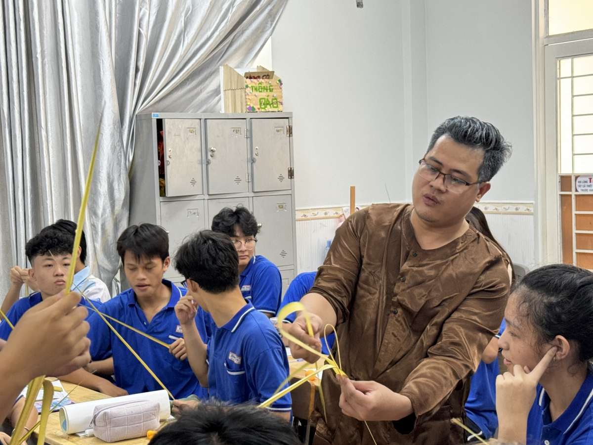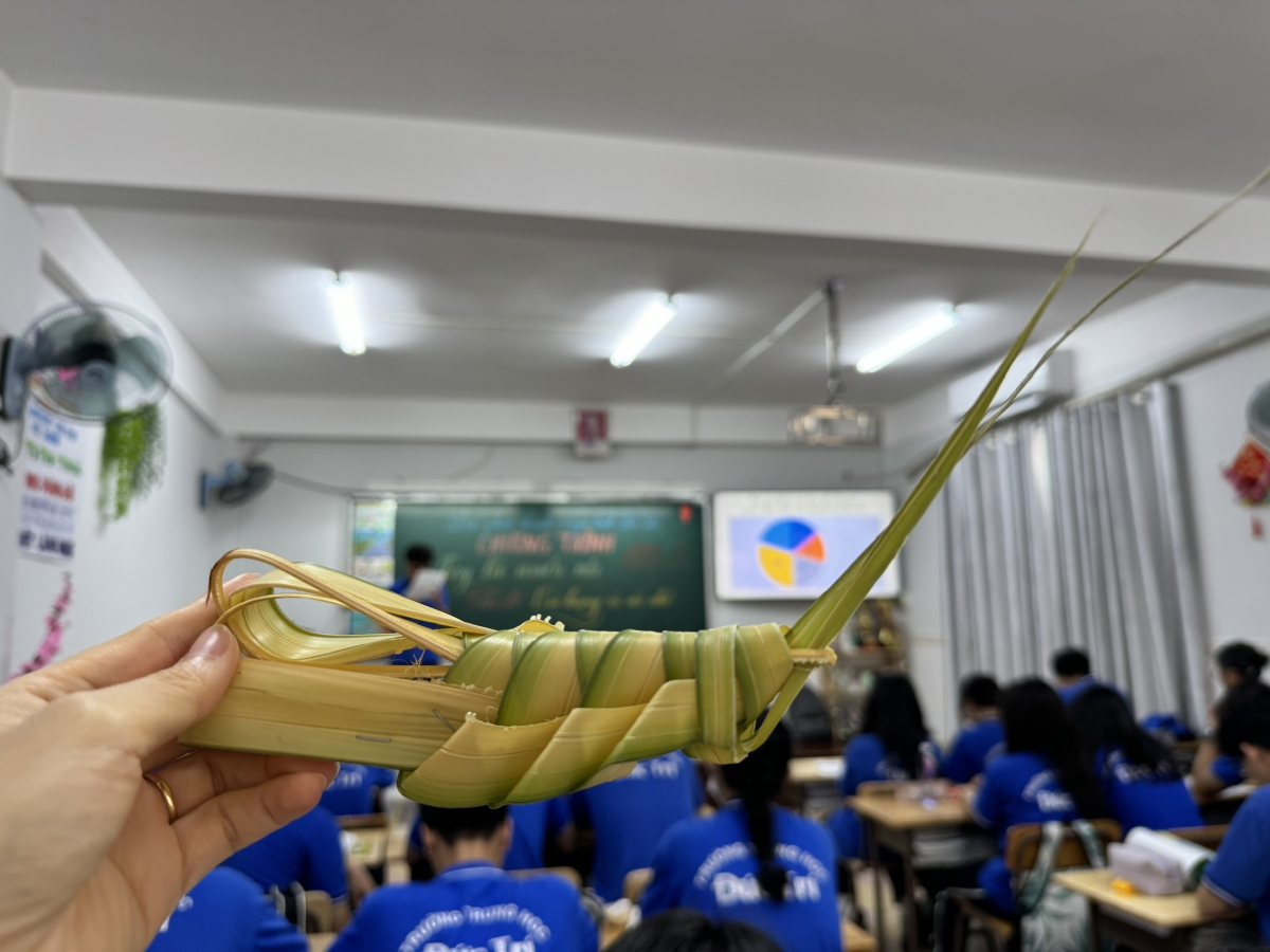Tiếp theo, các em tham gia hoạt động cảm nhận mùi thơm quê hương trong từng chiếc bánh con sùng và thắt con cào cào bằng lá dừa nước. Những ánh mắt háo hức, tò mò xen lẫn thích thú của học sinh đã khiến tiết học trở nên thú vị và sinh động.