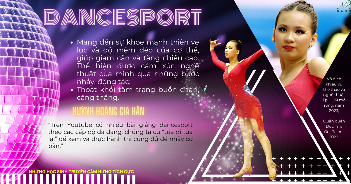 Khánh Ngọc tập luyện bộ môn này từ năm 2016. Bạn chia sẻ, dance sport giúp cho bạn có sức khoẻ tốt, cơ thể dẻo dai hơn, giải toả căng thẳng sau một ngày học tập miệt mài. Còn bạn Gia Hân cho biết, bộ môn này mang đến sự khỏe mạnh thiên về lực và độ mềm dẻo của cơ thể, giúp giảm cân và tăng chiều cao. Với Gia Hân, nhảy dancesport là cách bạn thể hiện được cảm xúc nghệ thuật của mình qua những bước nhảy, động tác; đôi khi dancesport còn giúp bạn thoát khỏi tâm trạng buồn chán, căng thẳng.