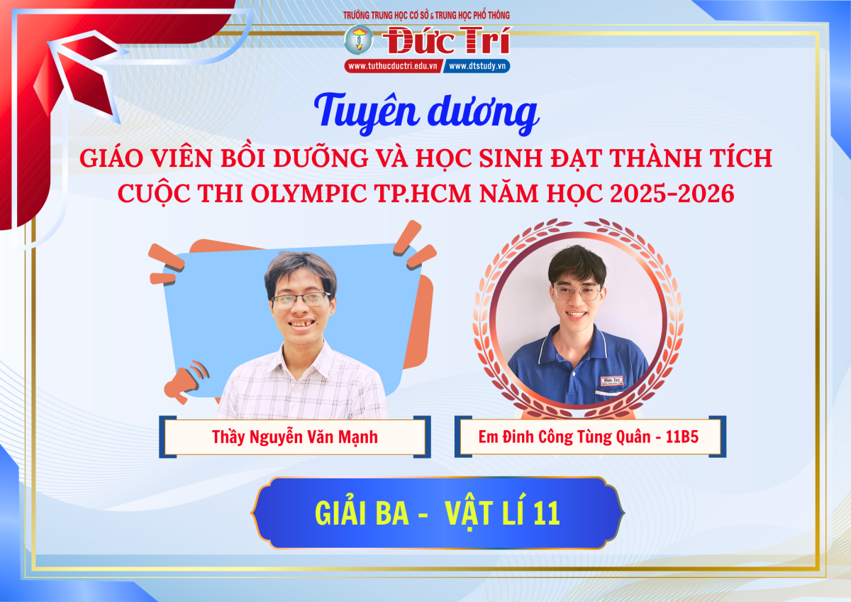 Xin chúc mừng đội tuyển học sinh giỏi Trường THCS và THPT Đức Trí đã xuất sắc mang về 12 Giải Ba tại Cuộc thi Olympic Thành phố Hồ Chí Minh năm học 2025–2026.