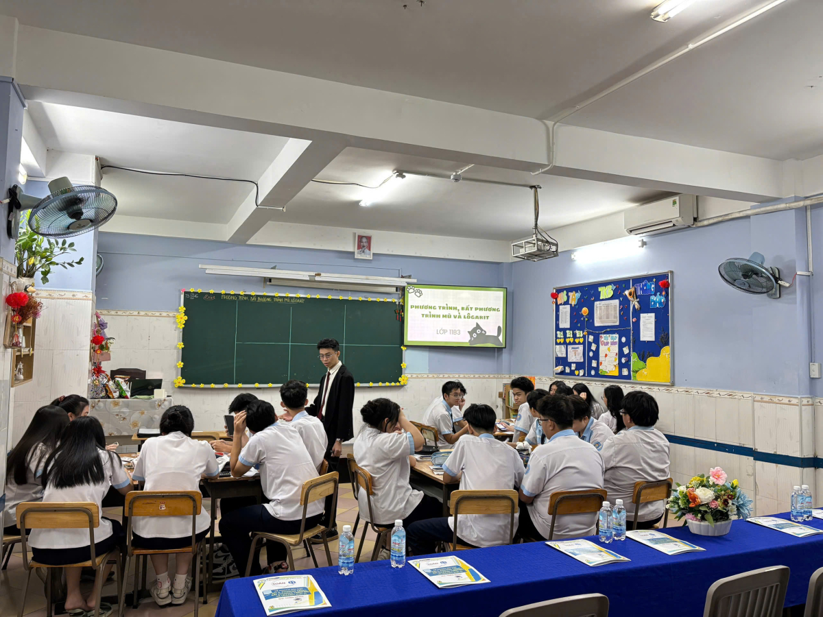 Tiết thao giảng với chủ đề “Phương trình, bất phương trình mũ và lôgarit”, giáo viên thao giảng: Thầy Trần Minh - lớp 11B3. Tiết học được thực hiện dưới dạng nghiên cứu bài học phù hợp với chương trình phổ thông mới 2018. Học sinh chuẩn bị dưới sự giao nhiệm vụ, hướng dẫn của giáo viên, lớp chia thành 3 nhóm chuẩn bị các nội dung và thực hiện báo cáo. Tiết học thật sự hấp dẫn khi các em học sinh say mê báo cáo, thuyết trình, phản biện lẫn nhau, thực hiện các nhiệm vụ của từng nhóm và cùng với giáo viên đánh giá nhận xét cho điểm các nhóm còn lại. Cuối tiết học, giáo viên đã tổng kết lại nội dung bài học chi tiết đầy đủ. Tiết thao giảng đã nhận được sự khen ngợi rất nhiều từ các thầy cô trong cụm 8. Hi vọng, các em học sinh sẽ có thêm nhiều tiết học bổ ích, thú vị để môn Toán không còn KHÔ – KHÓ mà trở nên HAY – HIỂU và các em học sinh hạnh phúc khi học Toán.